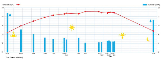 Vaisala gave us a Hand-Held Humidity and Temperature Meter HM40 for our everyday measurement needs. As you can see from the measurements made with HM40, the daily temperature was at its highest around noon, when the sun was at the zenith. As stated above, also the relative humidity of the air was at its lowest at that time. For reference, the recommended relative humidity in households is around 25–55 percent.