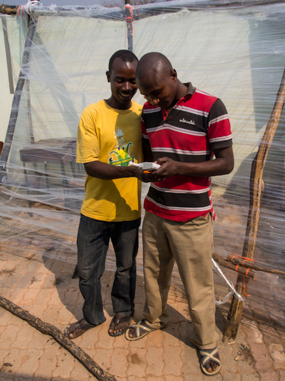 Two Zambian scouts measuring the air temperature and humidity with Vaisala’s HM40 device in front of our plastic wrap sauna.