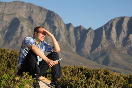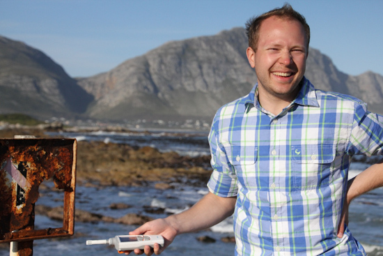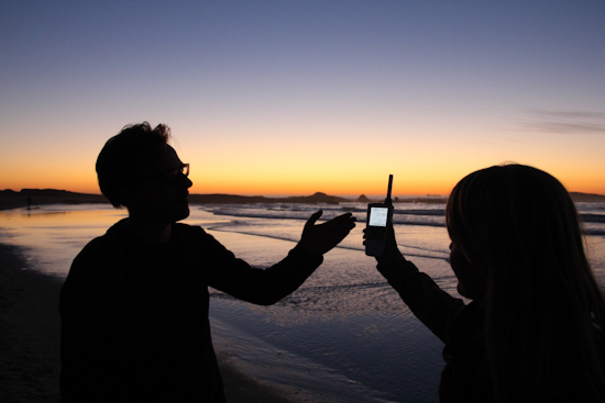 Emil and Emilia investigating the temperature of the sunset by the Atlantic Ocean in Cape Town.