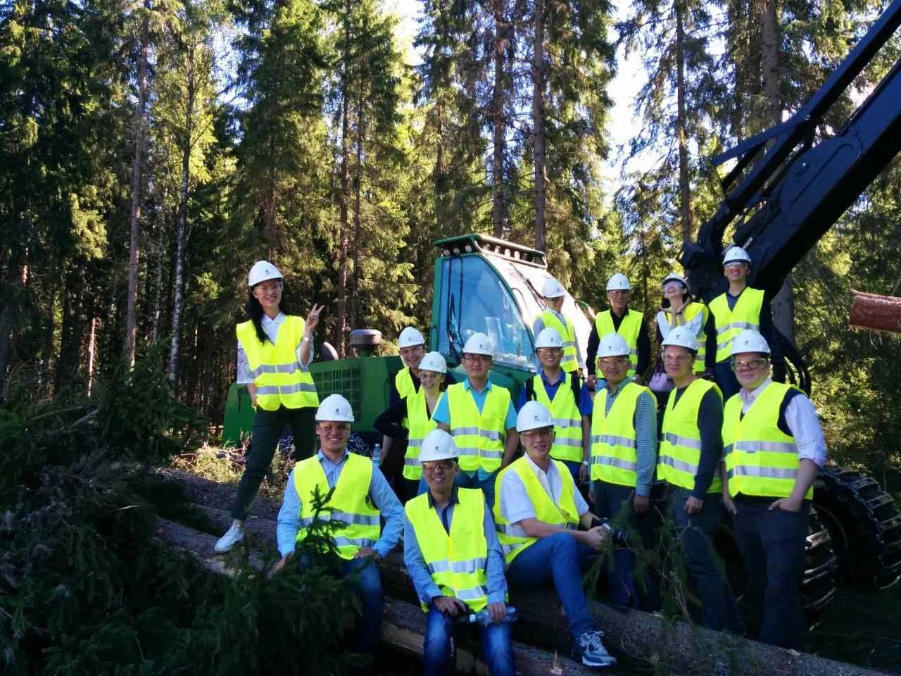 Bussimme matkasi kohti Turenkia, missä sijaitsi UPM:n pääkaupunkiseutua lähimpänä oleva puunhakkuukohdettta. Matkan aikana saimme kuulla Aili Piiroselta UPM:n toiminnasta maailmalla, mutta erityisesti Kiinassa. UPM:n yksi suurimmista tehtaista sijaitsee Jiangsun provinssissa. Tehtaalle on tulossa piakkoin uusi tehdaskoneisto, jolla saadaan tuotettua jopa 360 000 tonnia erikoispapereita vuodessa. Reilun 1,5 tunnin matkan jälkeen saavuimme hakkuualueelle, missä saimme suojaksemme kypärät. Kypärät ja liivit herättivät kiinnostusta Tsinghuan opiskelijoissa, mutta enemmän innostusta herätti kun pääsimme taivaltamaan syvemmälle metsään.