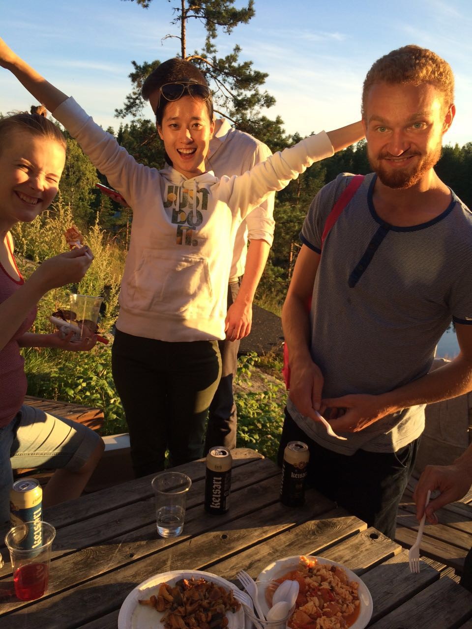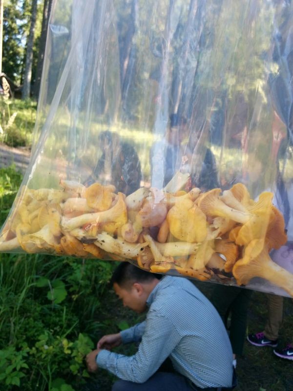 Hakkuualueelta suuntasimme UPM:n edustusmökille ja tämä olikin ensimmäisiä kesämökkejä, joita Tsinghuan opiskelijat pääsivät näkemään, jos Otaniemen Rantasaunaa ei lasketa. Mökki sijaitsi luonnonläheisellä alueella järven rannassa. Ennen ruokaa saimme myös mahdollisuuden poimia sieniä ja mustikoita läheisestä metsästä. Mustikat nautimme saman tein, mutta löydetyt kantarellit säilytimme vielä illan ruokaa varten. UPM tarjosi meille herkullisen lounaan. Tsinghualaiset pääsivät maistamaan siikaa, uusia perunoita ja kantarellikastiketta.