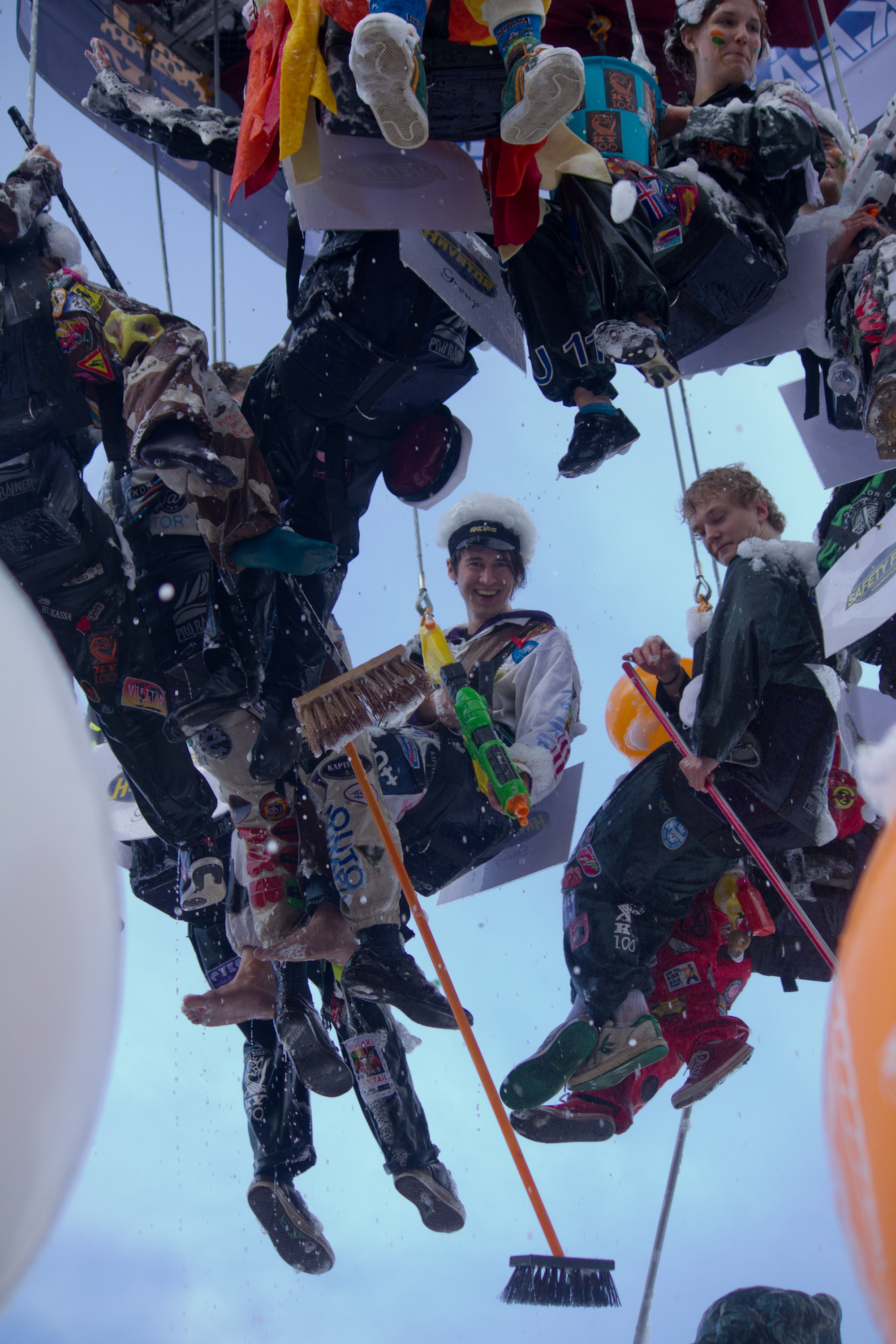 Jostain alhaalta suihkutetaan jääkylmää vettä päällemme. Ilmakin on keväisen raikas. Paleltaa. Ylhäältä taas leijailee saippuavaahtoa niskaamme. Sitä menee silmiin. Kirvelee. Killumme valjaissa jossain kymmenen metrin korkeudessa aseistautuneina vesipyssyin ja katuharjoin. Alapuolellamme komeilee pronssinen patsas ja ympärillämme tilannetta seuraa kymmenien tuhansien ihmisten hilpeä massa.