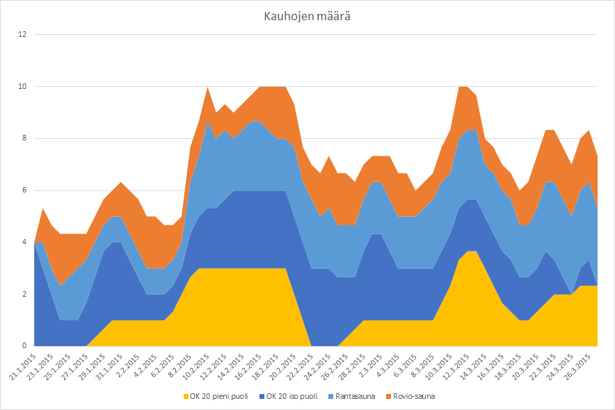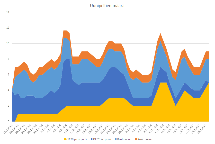Uunipeltien kuvaajasta näkyy selvästi miten uunipellit ovat ajan mittaa siirtyneet OK 20 isolta puolelta pienelle. Muistakaa varsinkin useampia tiloja kerralla varaavat ajatella myös tulevia käyttäjiä ja jättää tavarat oikeille paikoilleen! Jos jokainen jättää jonkun asian vähän paremmin kuin edellinen käyttäjä niin tilat pysyisivät paljon nykyistä paremmassa kunnossa ja paremmin varusteltuna.