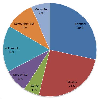 Työajan olen jakanut seitsemään osa-alueeseen oman harkintani mukaan. Tapaaminen, kokoontuminen ja kokous ovat ehkä hankalimmat erottaa. Tapaamiset ovat yksittäisiä alle 5 ihmisen kokoontumisia, kun taas kokoontumiset voivat olla esim. viikoittain toistuvia ja sisältää useita henkilöitä. Kokoukset ovat virallisia kokoontumisia, joista pidetään pöytäkirjaa ja joissa tehdään päätökset. EdusBlogi Käykö AYYtuksen alle olen laittanut myös tapahtumien järjestelyt, suunnittelut ja jälkityöt.