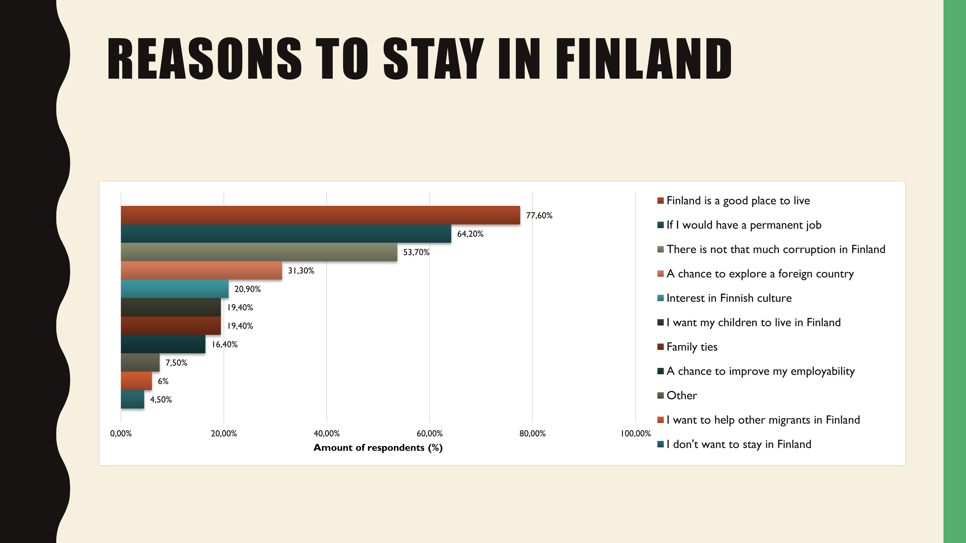 In addition to the quality of the employment there are still issues with discrimination. I found in my study that 20% of the respondents had faced discrimination and even more considered that employers do not trust immigrants. Similar results were found in the study conducted by OTUS, where 42,4% of the respondents had negative experiences about employers’ attitudes towards internationals.
