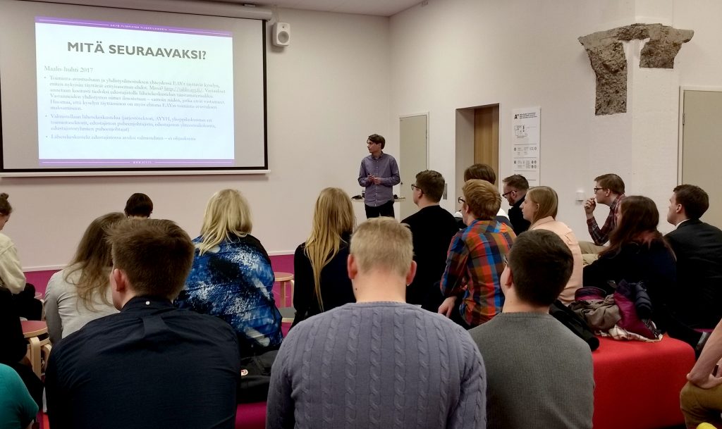 Itse vedin workshop-osuutta neljälle ainejärjestön puheenjohtajalle. Keskustelua käytiin erityisesti siitä, mikä AYY:n brändi on nyt – vai onko sellaista olemassa ollenkaan. Lisäksi pohdittiin, missä määrin AYY:n pitäisi olla sidottuna Aallon brändiin. Monista asioista oltiin samaa mieltä, mutta osa aiheista kirvoitti tiukkaa keskustelua.