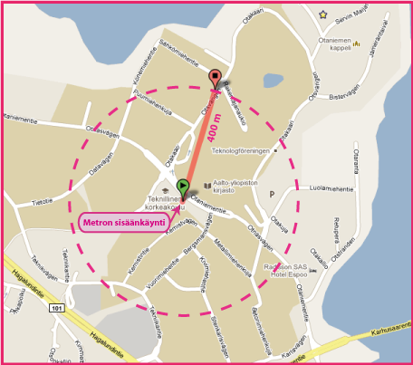 Myös Otaniemen kampuksen sisällä kävellen matkaa taittaen välimatkoihin saa helposti kulumaan viisitoista minuuttia pelkästään eri rakennusten välillä. Useille opiskelijoille useiden rakennusten välillä suhaaminen onkin jo nykyisellään arkipäivää ja pahimmillaan siihen saattaa kulua reilu siivu päivittäisestä ajasta. Toki tämä voi olla myös tehokasta aikaa joko liikunnallisessa tai sosiaalisessa mielessä mutta silti, se on yksi tulevaisuuden kampusrakenteen haasteista. Kuinka laajan kampuksen sisällä palvelut ovat tasaisesti käytettävissä ja kuinka mutkattomasti ihmiset liikkuvat kampusalueen sisällä?