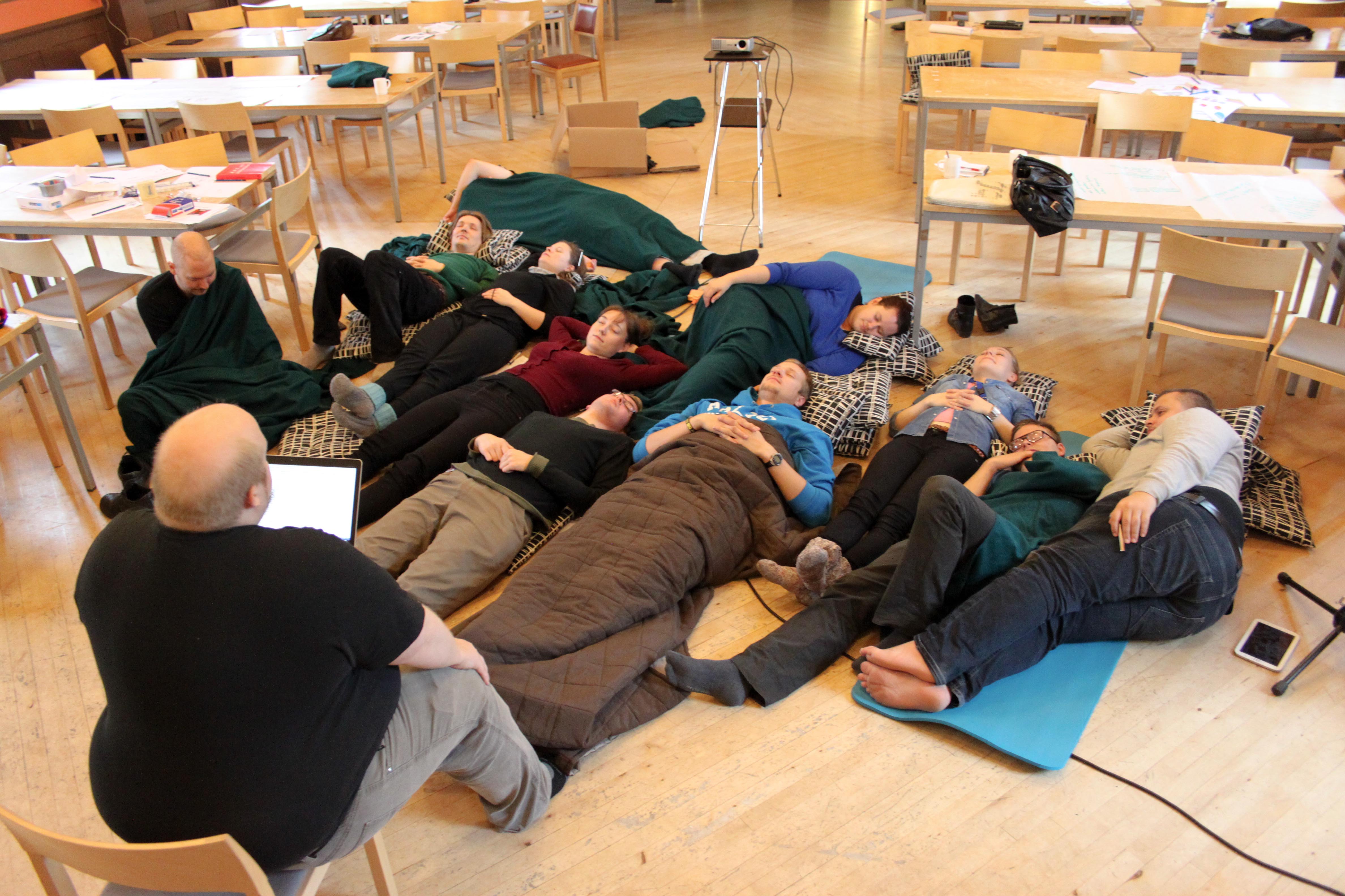 Asiantuntija Hannu Jaakkola lukee suunnittelumökin väelle tarinaa unelmien ylioppilaskunnasta 2020
