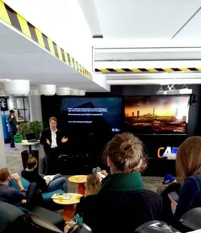 The event began with Futurice’s experts’ introduction on branding, which gave everyone present a comprehensive overview on what branding really means. In addition to the basics of branding, the speakers presented examples of particularly successful branding events, such as last year’s two-week plumbing renovation that caused quite a fuss. If you want to find out more about the basics of branding, check out our previous blog entry: /blogi/2017/03/23/ayy-branding-1-0/